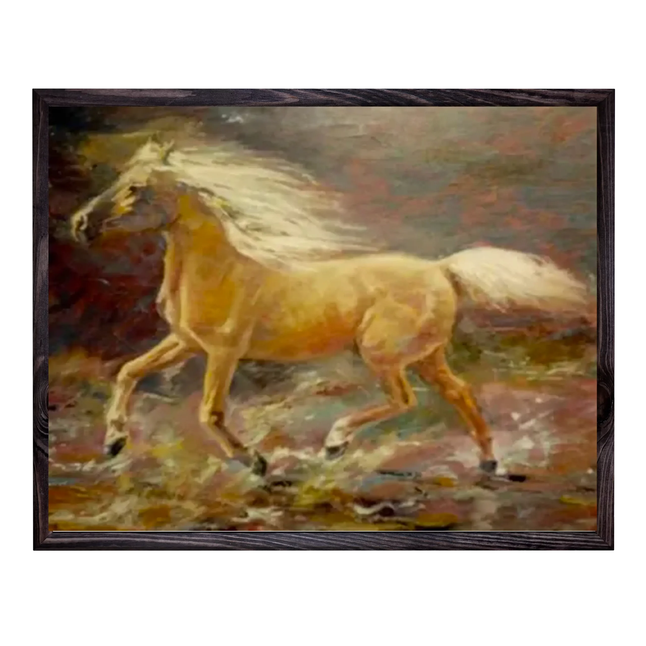 Description : Ce tableau montre un cheval doré galopant à travers un paysage abstrait. Les couleurs douces et les textures délicates donnent une impression de mouvement et de grâce.