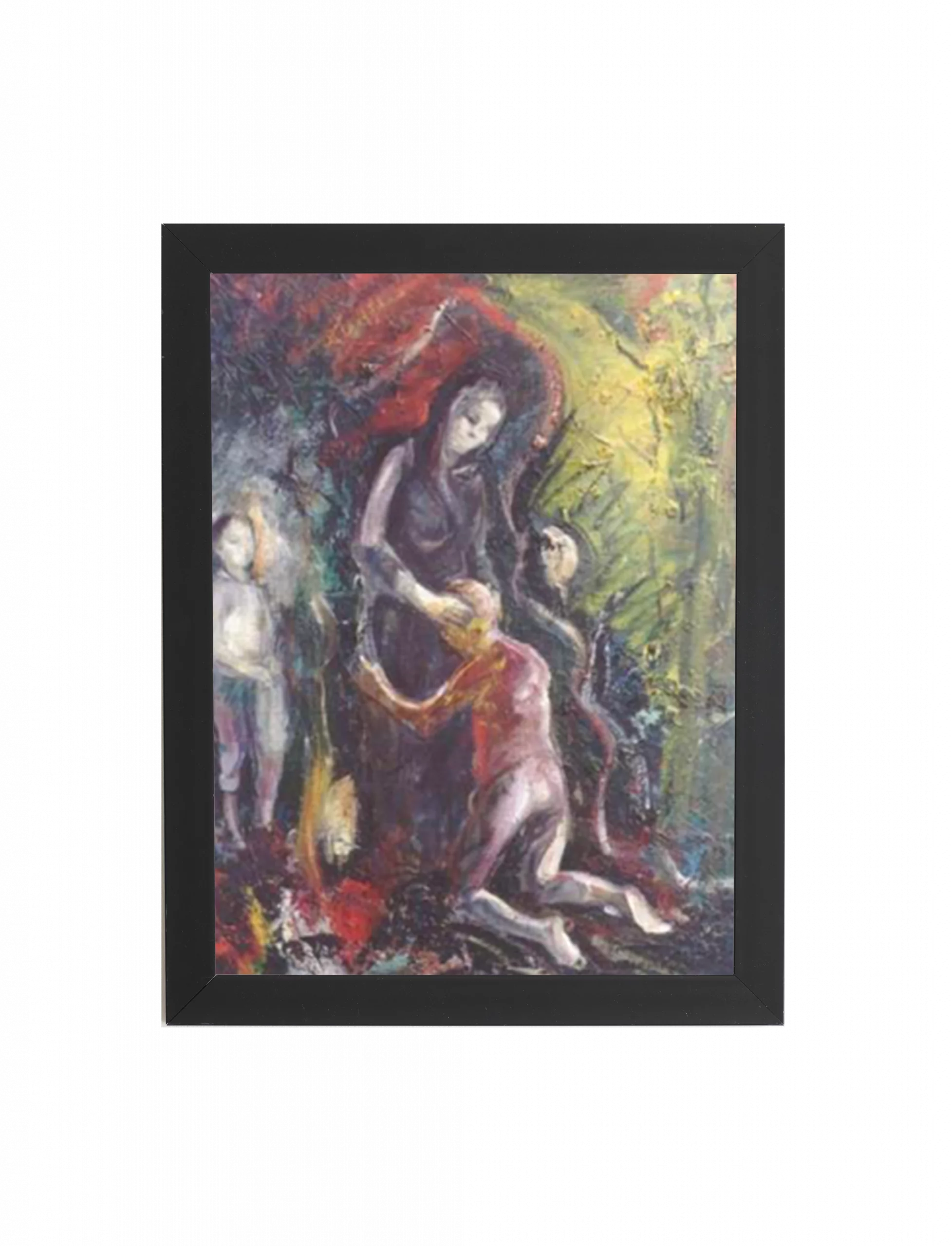 Description : Cette scène émotive montre une figure agenouillée devant une autre dans un geste de supplication ou de réconciliation. Les couleurs sombres et les textures épaisses ajoutent une dimension dramatique à l’œuvre.