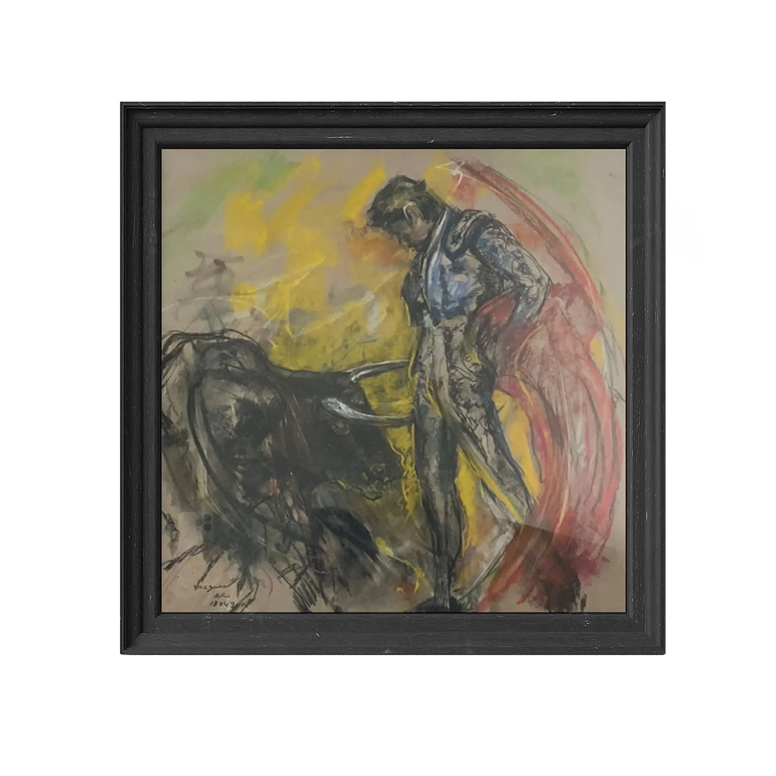Description : Cette œuvre représente un matador face à un taureau dans une scène de corrida. Les coups de pinceau dynamiques et les couleurs vives donnent un sentiment de mouvement et de tension.